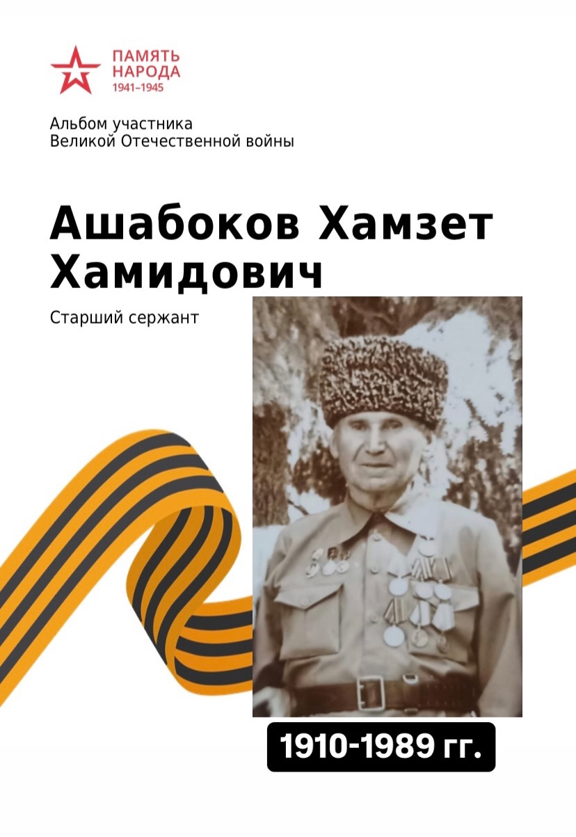 | ________________________________________ Ашабоков Хамзет Хамидович является родным дедушкой судьи Ашабокова Рашида Хасановича. _______________________________________ АШАБОКОВ Хамзет Хамидович Дата рождения: __.__.1910 Место рождения: Кабардино-Балкарская АССР, Чегемский р-н, с. Нартан Место призыва: Нальчикский ГВК Звание: ст. сержант НАГРАДЫ ГЕРОЯ: Медаль "За боевые заслуги", 1967 г. Орден Отечественной войны II степени, 1985 г. Упомянут в Книге Памяти. _________________________________________ ![]() Фотография предоставлена Ашабоковым Р.Х. |
